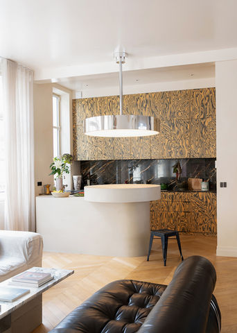 Le cœur de l’appartement réside dans une cuisine d'exception, pensée comme une pièce sculpturale. Les façades en placage bois Alpi Sottsass se distinguent par leur motif audacieux et hypnotique, à la fois naturel et graphique. Ce choix donne un caractère unique à cet espace et s’intègre harmonieusement dans l’univers chaleureux de l’appartement.
